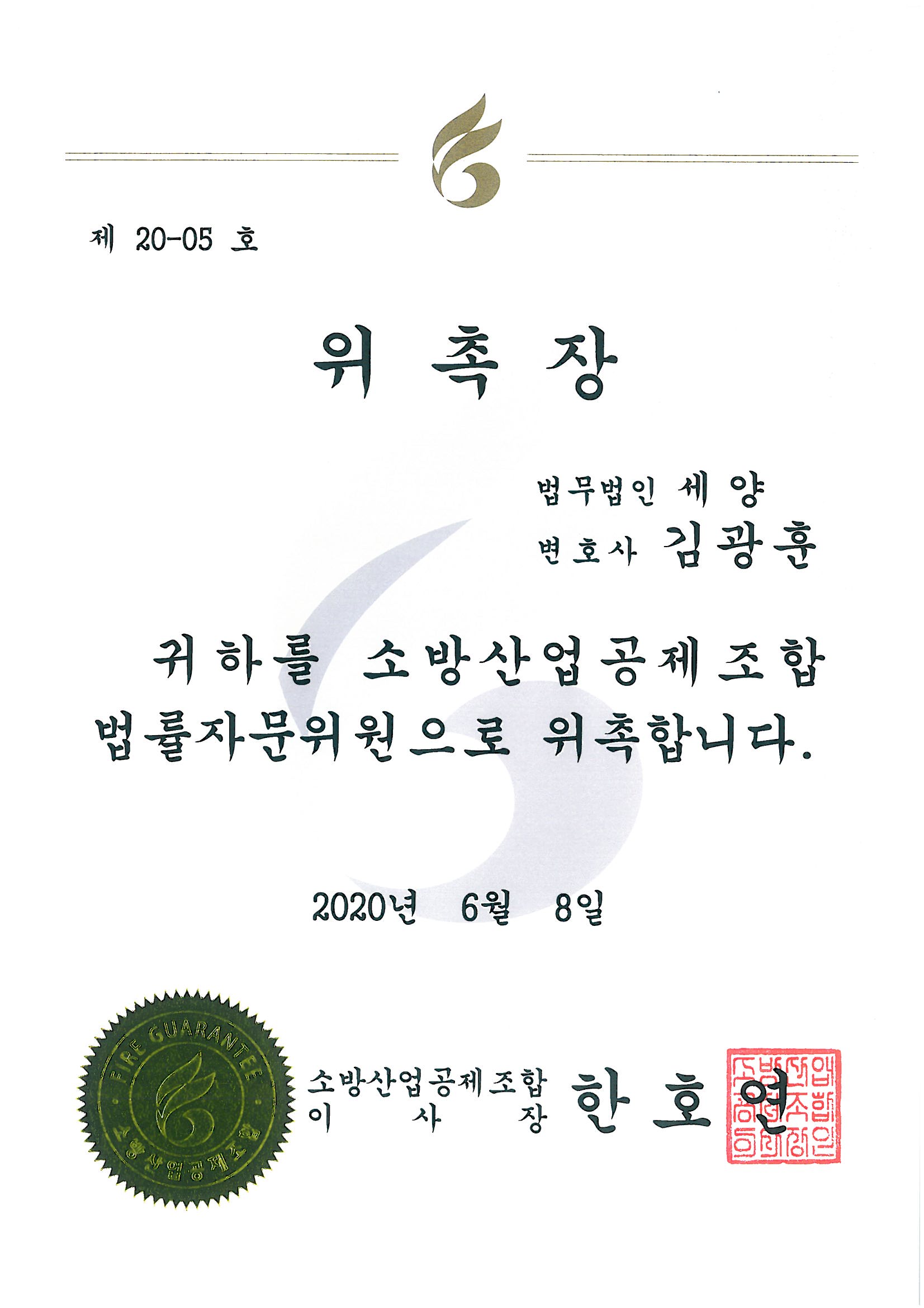 2020. 6. 8. 소방산업공제조합 법률자문위원으로 위촉되었습니다.